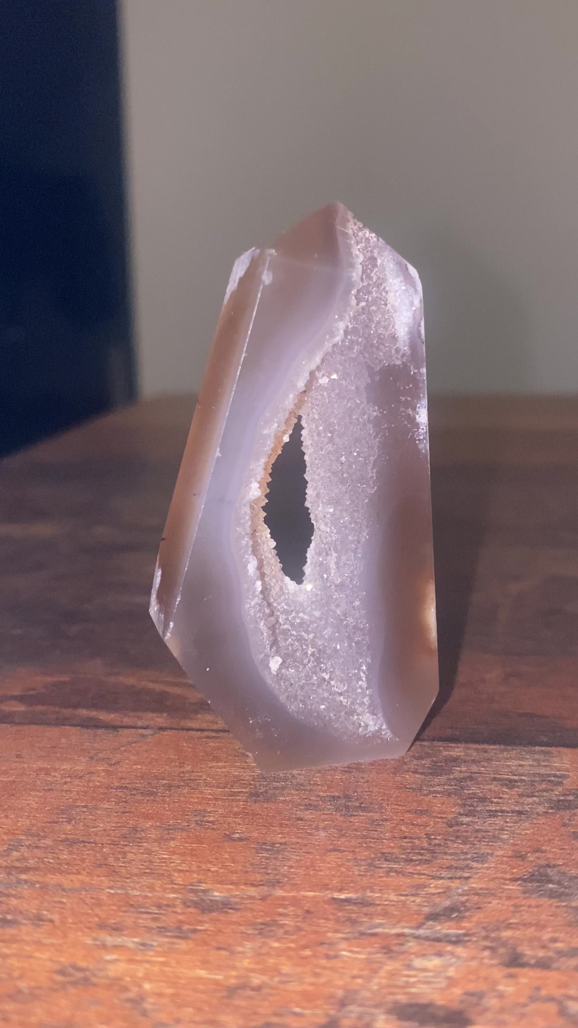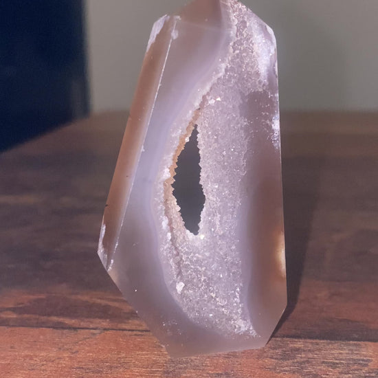 Diese wunderschöne Braun/Graue Achat Geode, eignet sich perfekt zur Dekorativen Gestaltung. Er kann auch mit seinen Eigenschaften dein Raumklima harmonisieren.
